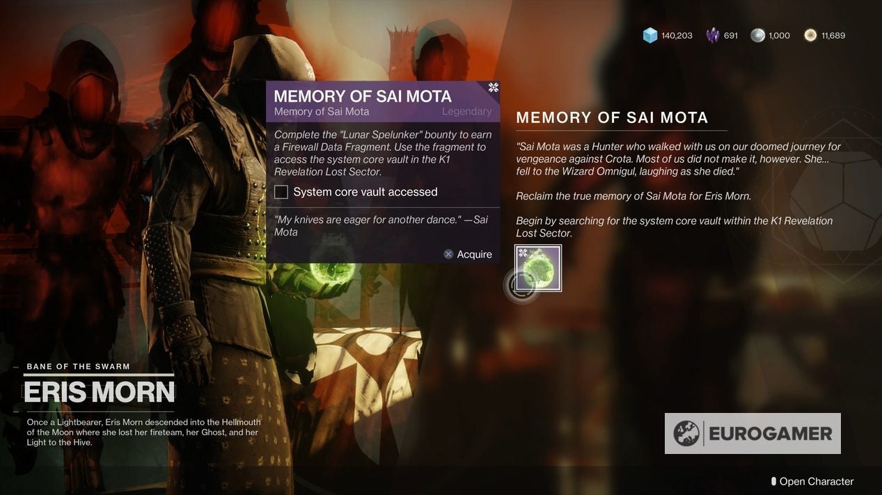 To complete this, pick upwardly the Lunar Spelunker weekly bounty from Eris'southward bounty listing. The Lunar Spelunker compensation has you complete the K1 Communion, K1 Logistics and K1 Crew Quarters Lost Sectors. Once yous have done it, paw in the compensation, which volition then complete this stage of the Memory of Sai Mota quest.